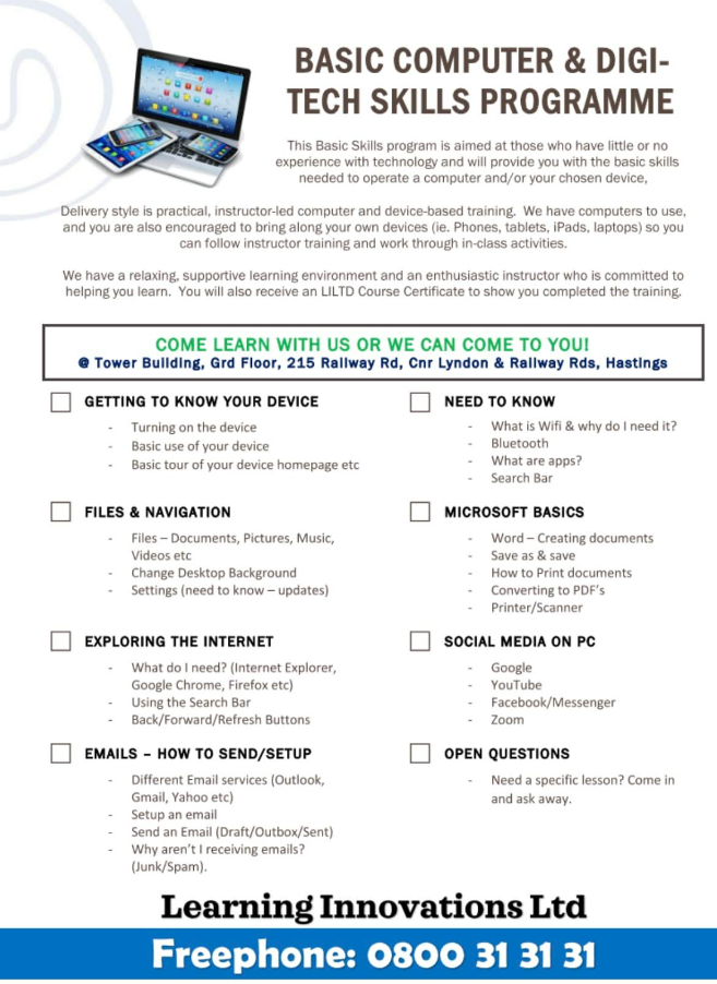 LEARNING INNOVATIONS has been funded by Mana Digital & Ministry of Social Development to offer FREE basic upskilling on Digital Devices (Computers, Phones, Tablets, iPads etc).